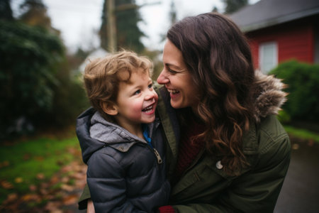 Young mother and little son enjoying leisure time together, having fun together, smiling outdoor. Solo parent, exuding strength and resilience while fulfilling both parental roles