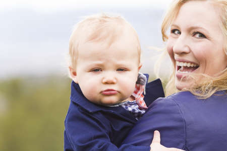 Side view portrait of a happy motherholding her boy on arms outdoors on the nature. Portrait for lifestyle design. Family day. Outdoor fun.