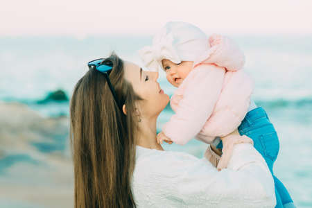 Loving mom holding her baby outdoors. Young mother hugging and kissing her little daughter