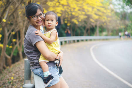 Asian mother bring her 1 year and 3 months son to see yellow trumpet flower in the park