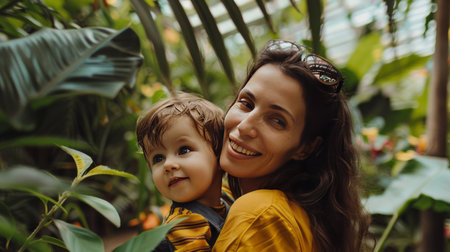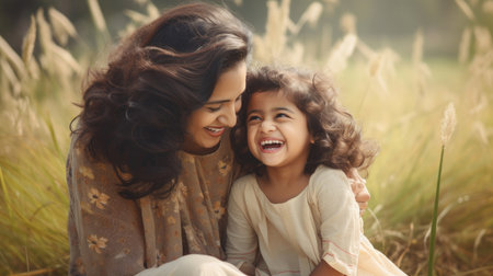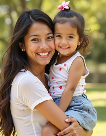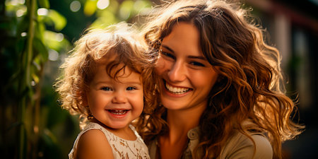 A radiant mother holds her smiling daughter close, surrounded by greenery and sunlight. Laughter fills the air as they enjoy their time together, sharing deep bonds of love.