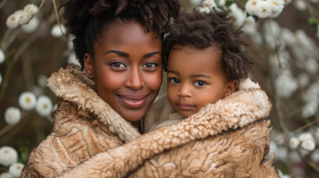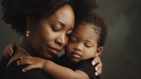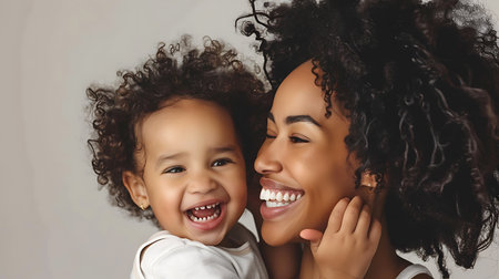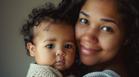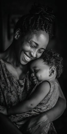 African american mother holding her smiling baby close, fostering a strong bond of love, affection, and happiness in a tender moment captured in a warm, monochromatic portrait
