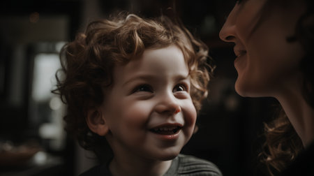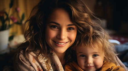 Mother and child are sharing a joyful moment, embracing each other with warm smiles, showing love and connection in a cozy environment.