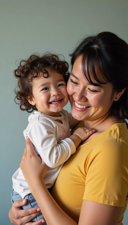 In a bright and inviting room, a mother cradles her smiling child close, both radiating happiness and love. Their bond is evident in this delightful moment of connection.