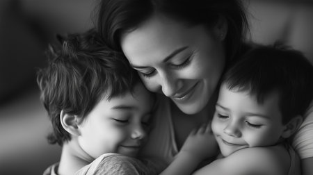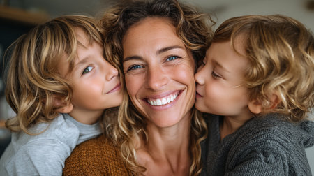 A mother joyfully embraces her two children in a cozy indoor setting on a calm afternoon