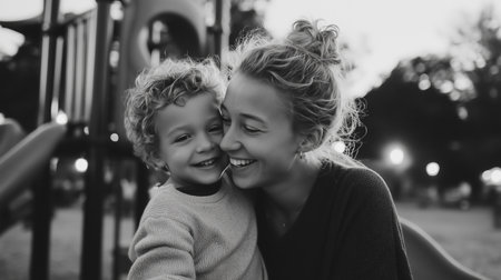 Joyful moments at the playground during sunset with mother and child