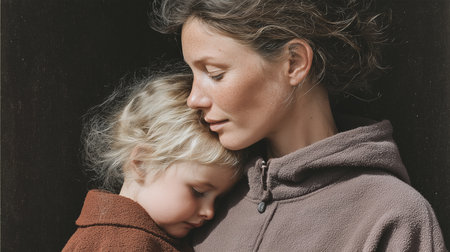 Mother holds child close in warm embrace during quiet moment together at home