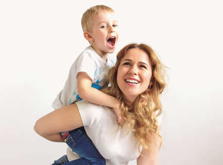 Portrait of a happy mother and her young son. mother and little boy play, selective focus