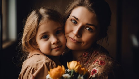 Little girl holding flowers, hugging her mother and celebrating mother's day.