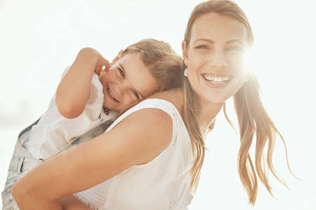 Happy woman piggybacking daughter outside in the sun. Carefree woman carrying young girl on her back while bonding outside on a bright summer day. Single mom enjoying quality time with her cute kid