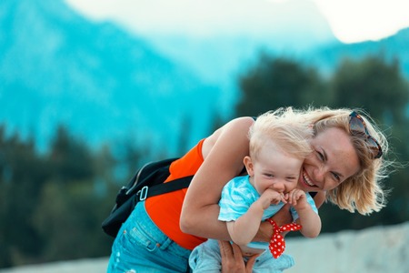 Young mother holding her little son in her arms and they are played against the backdrop of a mountain landscape