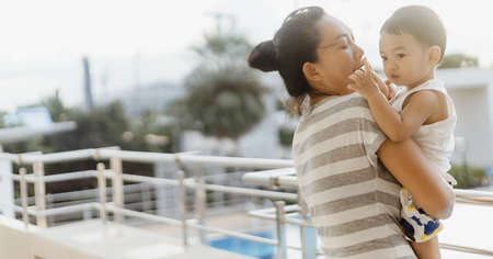 An Asian mother long black hair is hugging toddler son (1-year-old) looking to the view from the terrace on a sunny day. Family leisure times together activity and lifestyle concept. Outdoors portrait