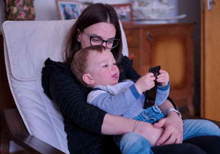 Mother holding her sweet little boy with mobile phone in his hands