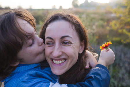 A child gives a flower to his mother, Boy kisses and hugs mom, a woman sniffs a flower, a portrait of a smiling woman, happy motherhood