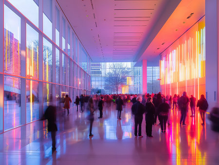 A spacious museum hall with large windows and vibrant neon lights People are walking and observing the art installations
