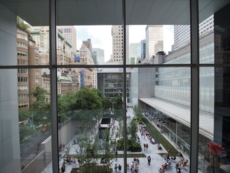 MoMA Sculpture Garden and NYC Skyline - The view of the Museum of Modern Art's sculpture garden from an upper floor window, with people relaxing and skyscrapers in the background.