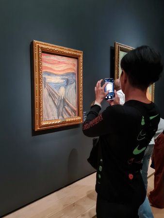 Oslo, Norway, July 15, 2023: A tourist observes the famous Edvard Munch composition The Scream
