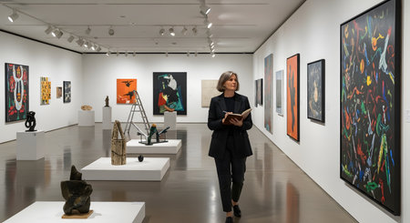 An elegant, mature woman walks through a brightly lit modern art gallery, holding a book. She is surrounded by abstract paintings and sculptures on display, thoughtfully observing the artwork in the quiet, spacious exhibition hall.