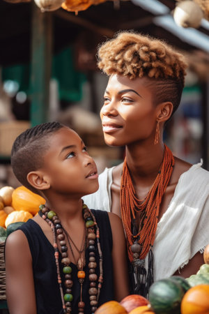 shot of a beautiful young woman at the market with her son, created with generative ai