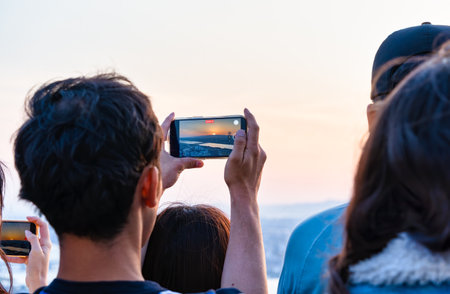 young woman taking a picture of a beautiful sunset with a smartphone