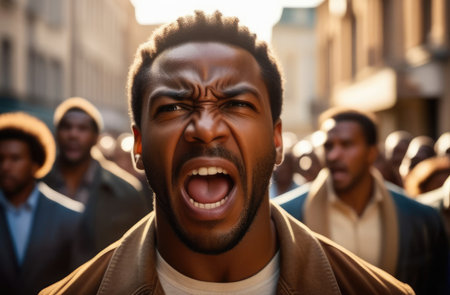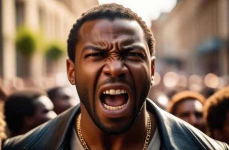 male activist striking against rights violation. angry black protester screaming on the street.