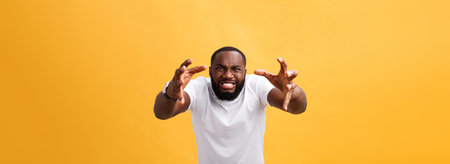 Portrait of african american man with hands raised in shock and disbelief. Isolated over yellow background.