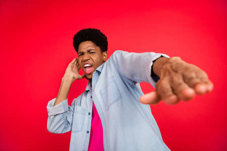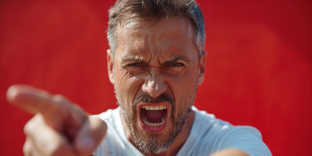man screaming and pointing furious isolated on background