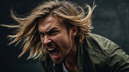 Man with long hair shouting passionately against a dark background during an intense moment captured outdoors