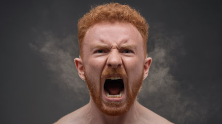A powerful close-up image showcasing a man with red hair and a beard, expressing intense anger. Smoke adds to the dramatic atmosphere against a dark backdrop.