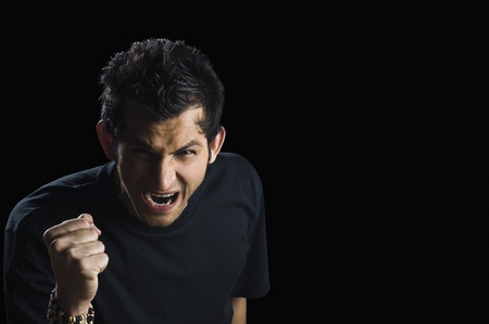 Angry young man screaming and clenching his fists in anger, isolated on white background