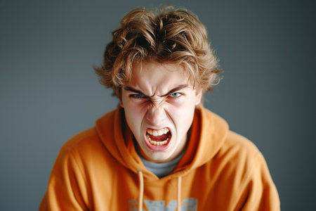 Young Adult with Curly Hair Showing Expression of Anger and Frustration Against Plain Background in Portrait Mode