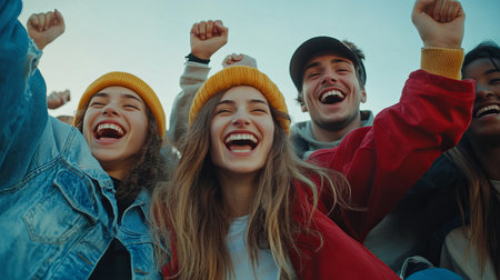 A vibrant moment captured of excited friends cheering together at a high school sports game, showcasing their joy and enthusiasm in a lively atmosphere.