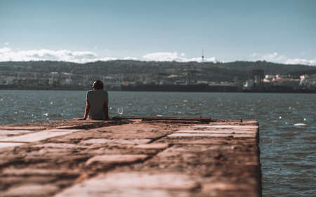 View from behind of a man in a t-shirt sitting on the edge of the pier in wireless headphones, with a glass of wine nearby and observing the river, water, and the opposite riverbank on a warm sunny
