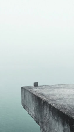 A minimalist platform juts out over tranquil water, enveloped in a soft haze of muted mint and gray, creating a harmonious and serene environment.