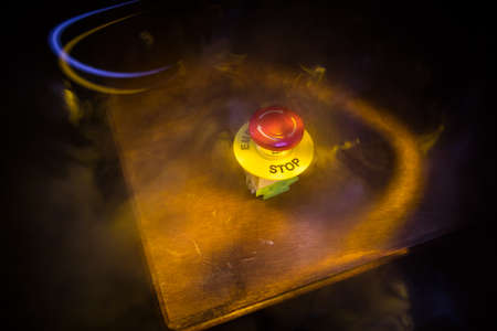Emergency stop button, Disaster protection. Industrial concept. Red button on table in dark low key background. Selective focus