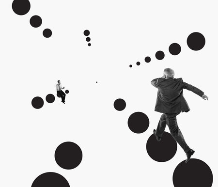 Contemporary art collage. Creative design. Partnership, cooperation. Businessman running to man working on laptop. Surreal artwork. monochrome.