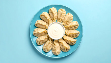 A blue plate displays dumplings arranged in a flower pattern around a central bowl of sour cream.