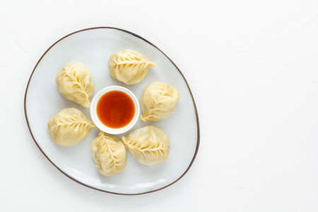 Closeup on traditional Central Asian steamed dumplings manty with red sauce