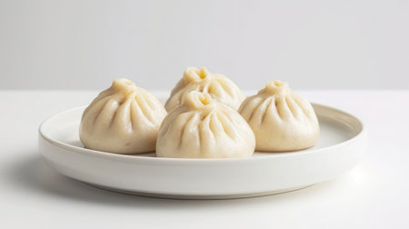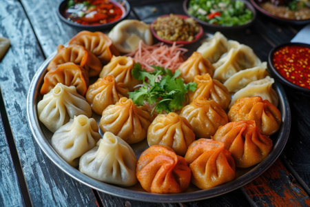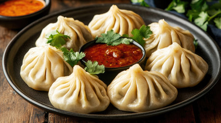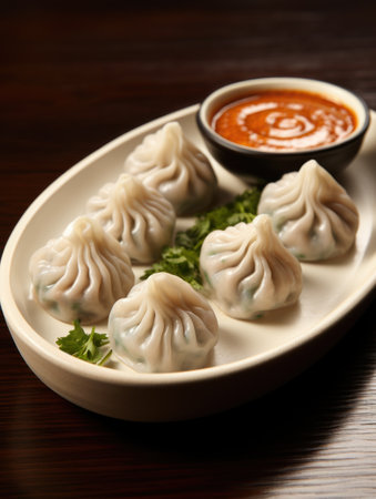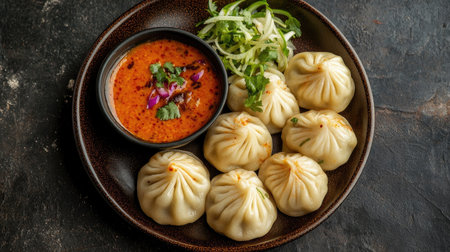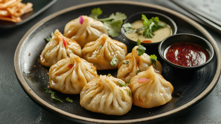 An elegant plate of momos, artfully arranged with colorful garnishes, positioned on a simple backdrop,