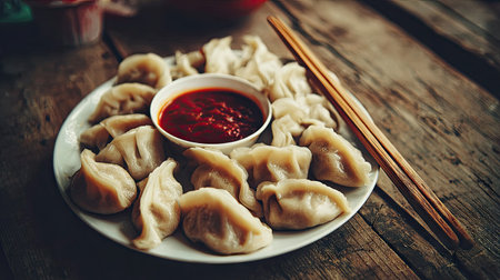 A close-up shot presents a plate of dumplings with a vibrant red dipping sauce. The dumplings are arranged artfully against a rustic wooden background alongside a pair of chopsticks. This image utilizes natural lighting, which enhances the textures, making it suitable for culinary presentations and food-related publications.