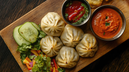 Top view of a delicious serving of momos with a side of dipping sauce and fresh veggies, presented on a wooden board,