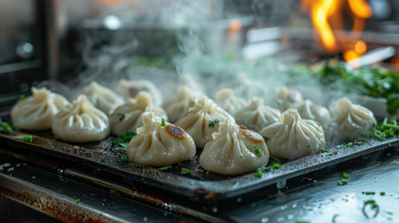 A vibrant overhead view of steaming dumplings being cooked in a bustling kitchen, highlighting the artistry and cultural significance of traditional culinary practices.