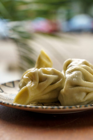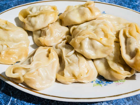 handmade cooked Manti dumpling on plate in rural home kitchen