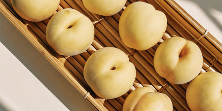 Fresh yellow peaches arranged in a bamboo tray under soft lighting.