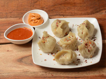 Traditional Nepalese food calls Momos. Steamed cooked momos with sauce.