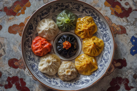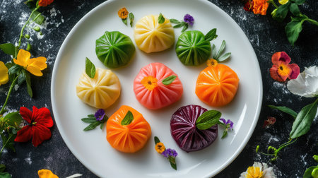 A vibrant display of dumplings arranged on a colorful plate, garnished with edible flowers and fresh herbs, showcasing culinary artistry and tradition.