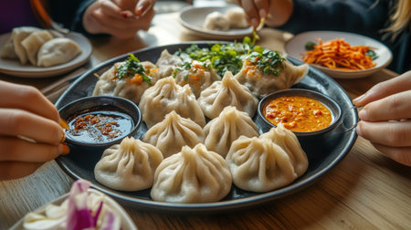 dim sum arranged on a plate with dipping sauce, created with generative ai