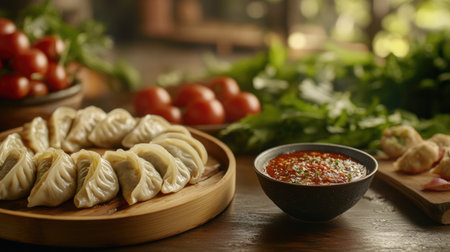 A tempting arrangement of fresh dumplings served with a spicy sauce, surrounded by vibrant vegetables, offering a warm and inviting dining experience.