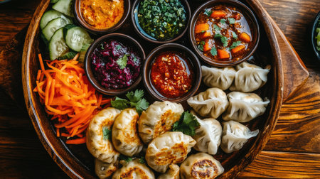 A vibrant and appetizing dumpling platter featuring assorted dumplings, colorful sauces, and fresh vegetables, perfect for sharing at gatherings or special events.