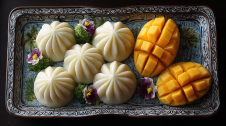 Soft sticky rice and fresh mango arranged in a spiral pattern on traditional ceramic ware